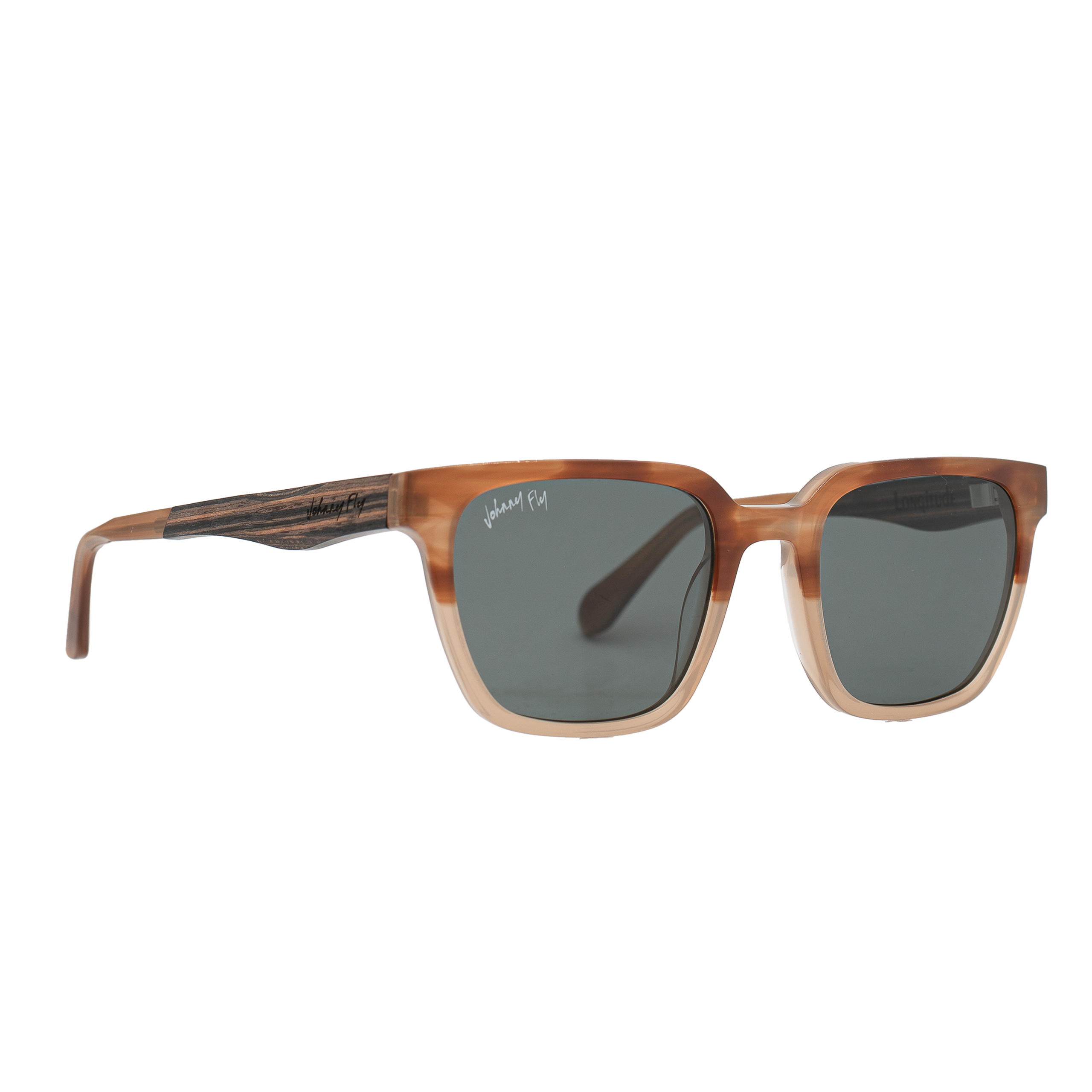 The Longitude: A humble approach to a high fashion look. This frame features our signature wood arms paired with an acetate front, medical grade spring hinges and polarized lensing that makes them Johnny Fly.