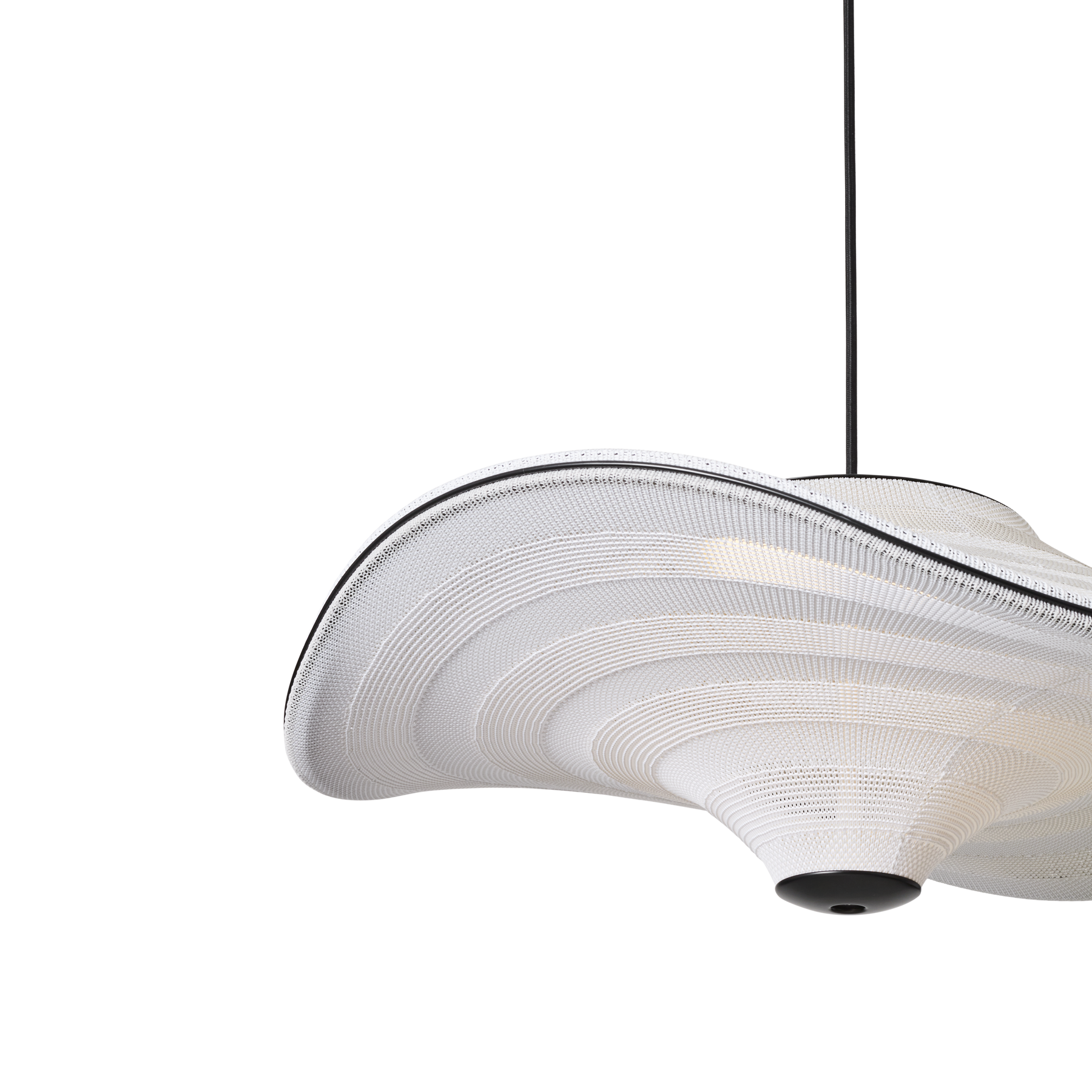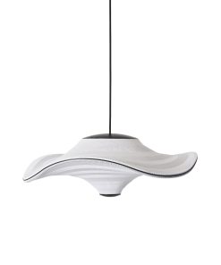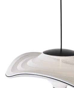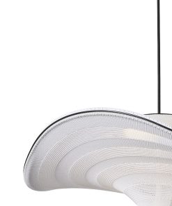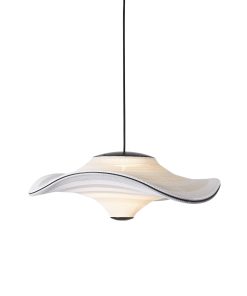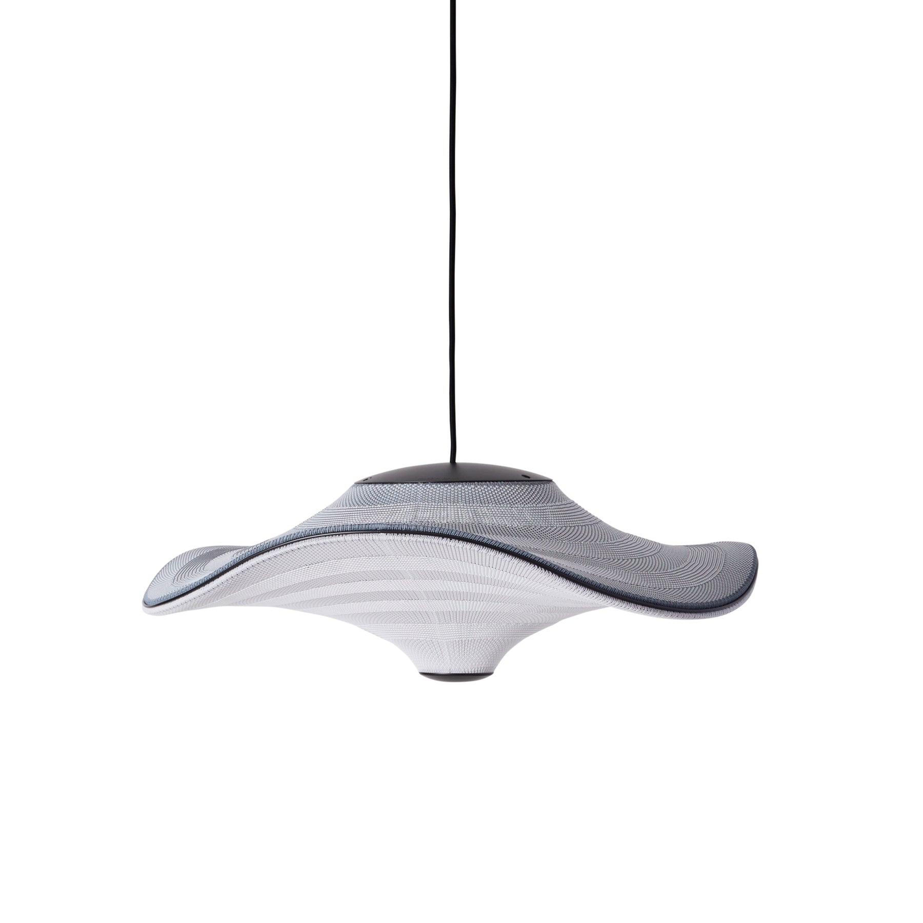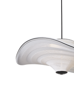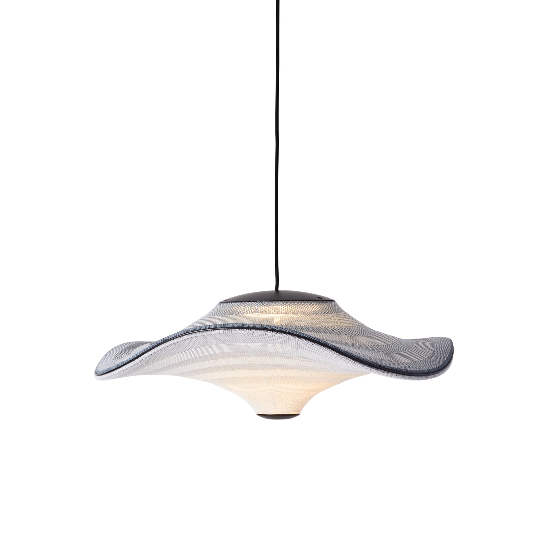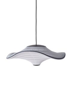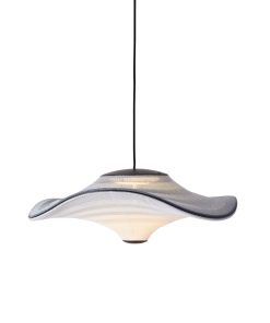 Flying is a family of sculptural pendant lamps with a soft organic shape. When suspended, they appear to float beautifully in the air. The distinctive shape of the Flying lamps is created by stretching the 3D knit material between the aluminium wavy frame and centerpiece that keeps the top and bottom apart. The LED light source is built into the top of the lamp so the light is softly diffused through the knitted bottom part of the lamp.