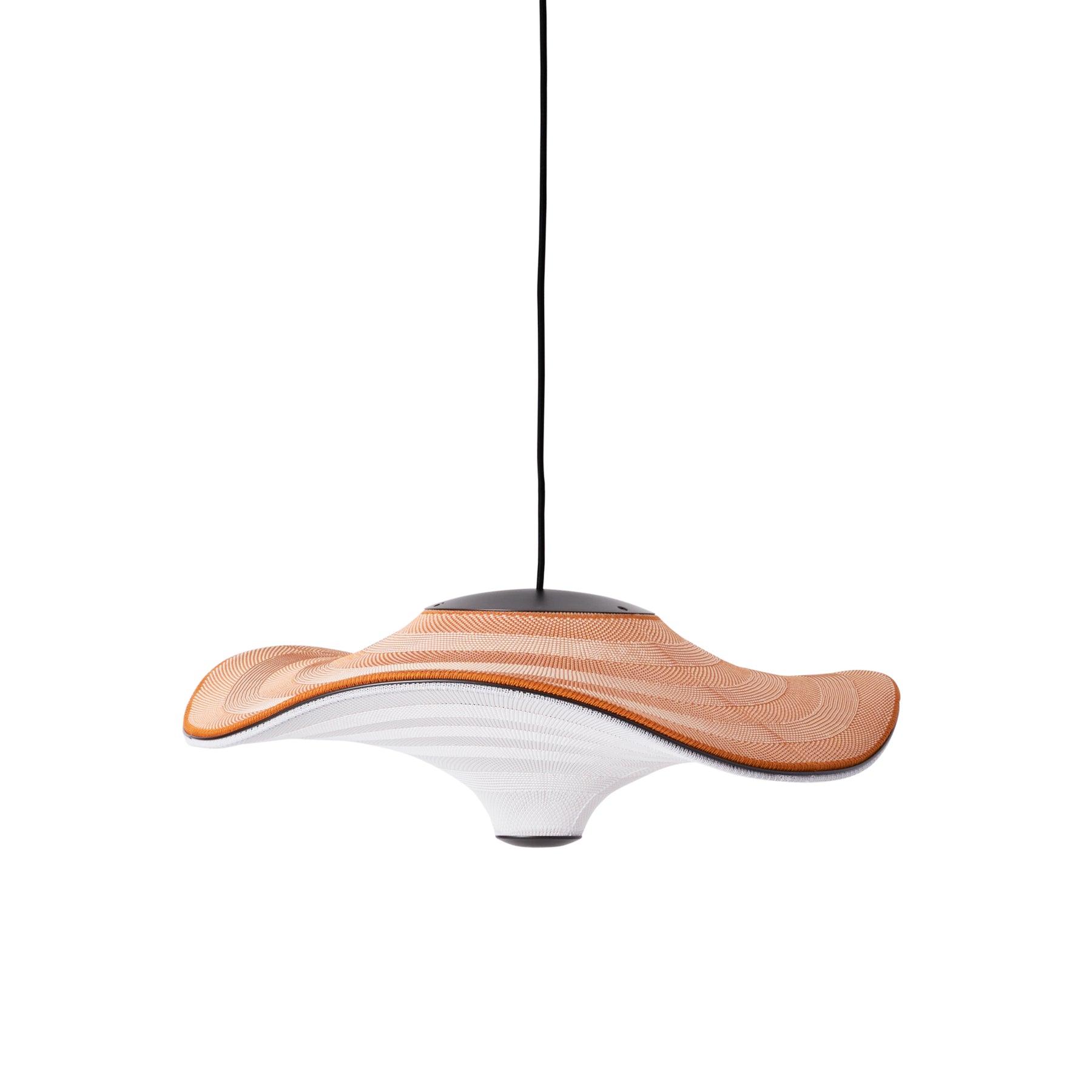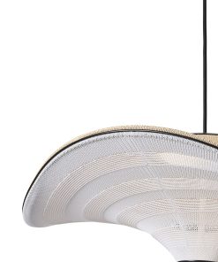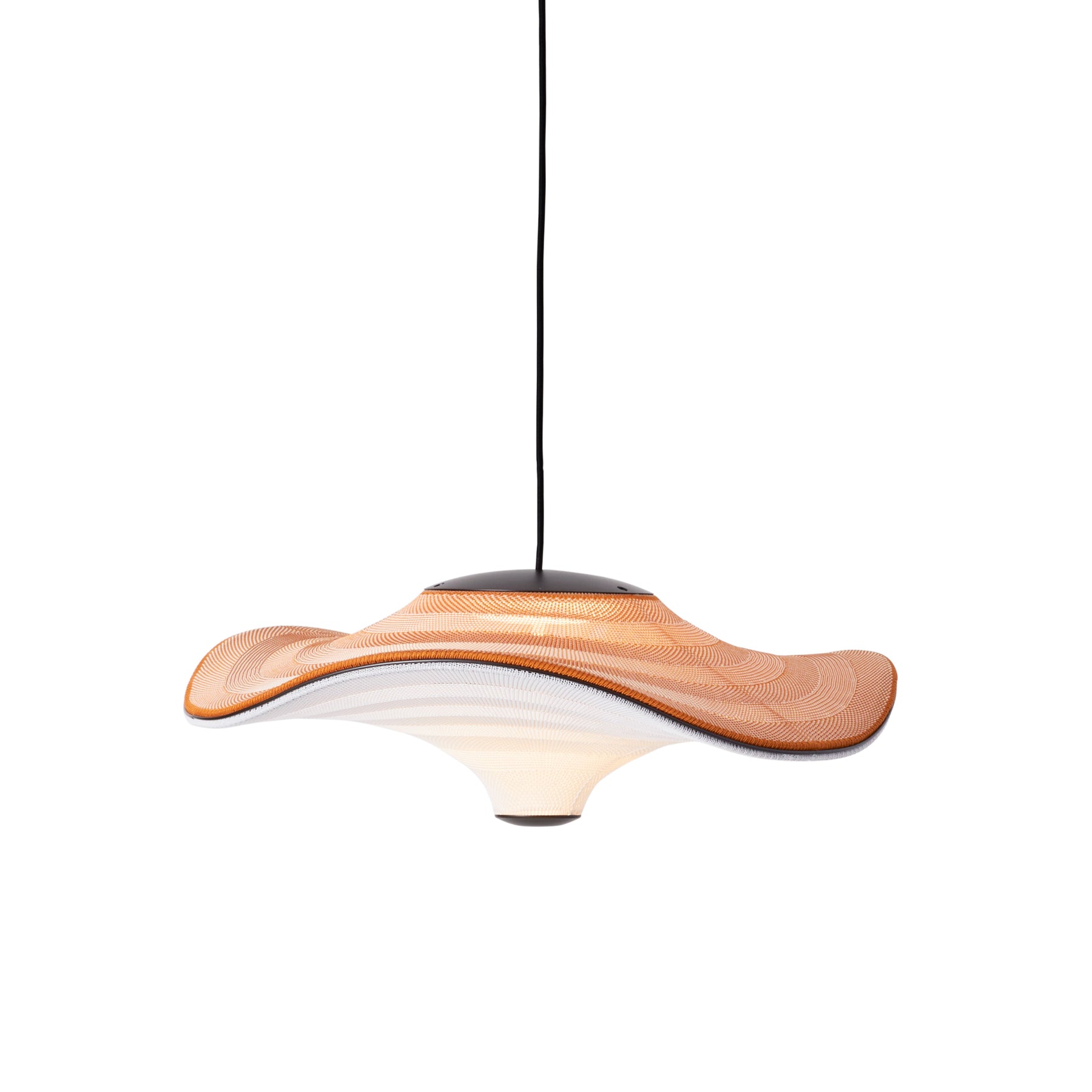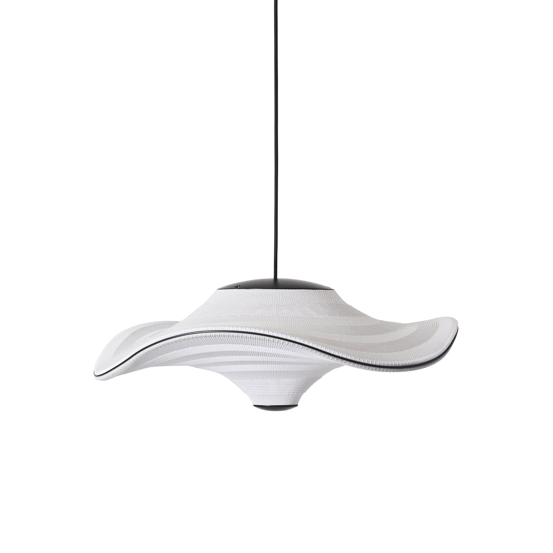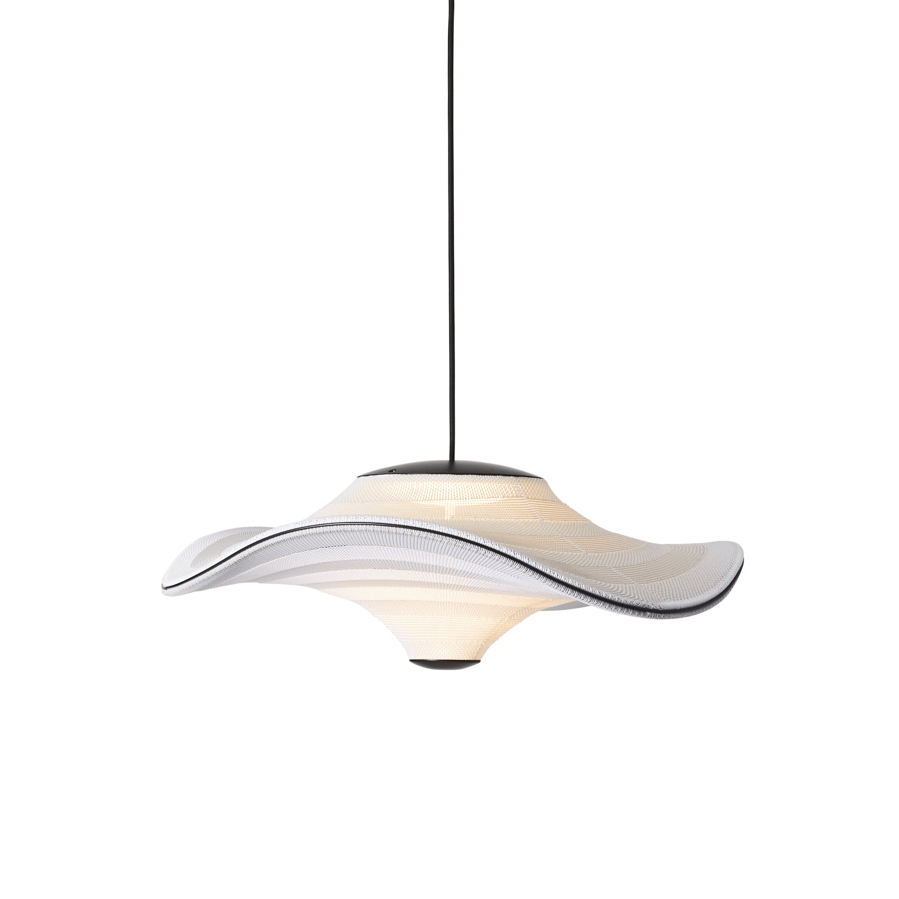 Flying is a family of sculptural pendant lamps with a soft organic shape. When suspended, they appear to float beautifully in the air. The distinctive shape of the Flying lamps is created by stretching the 3D knit material between the aluminium wavy frame and centerpiece that keeps the top and bottom apart. The LED light source is built into the top of the lamp so the light is softly diffused through the knitted bottom part of the lamp.