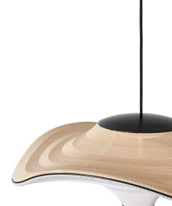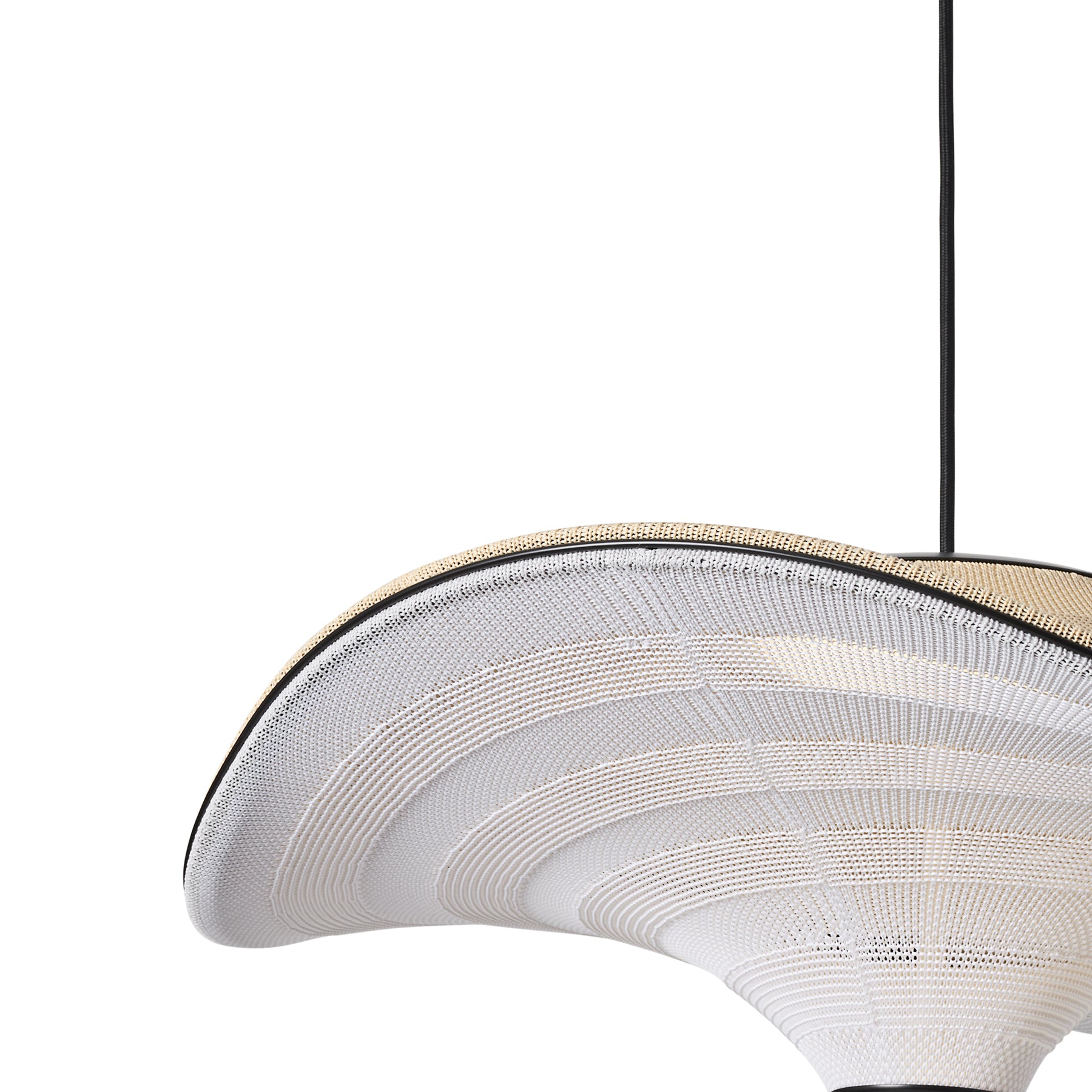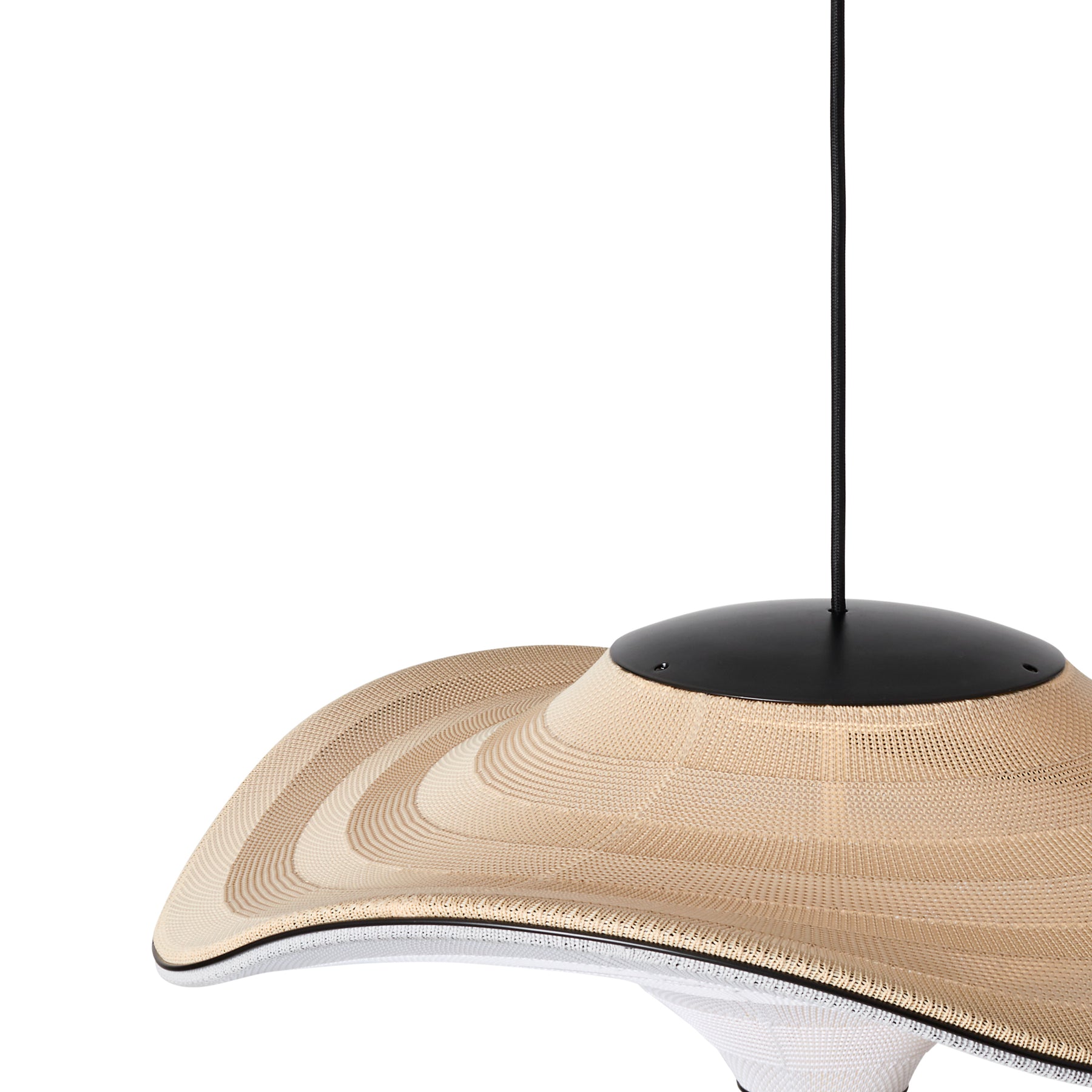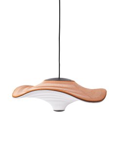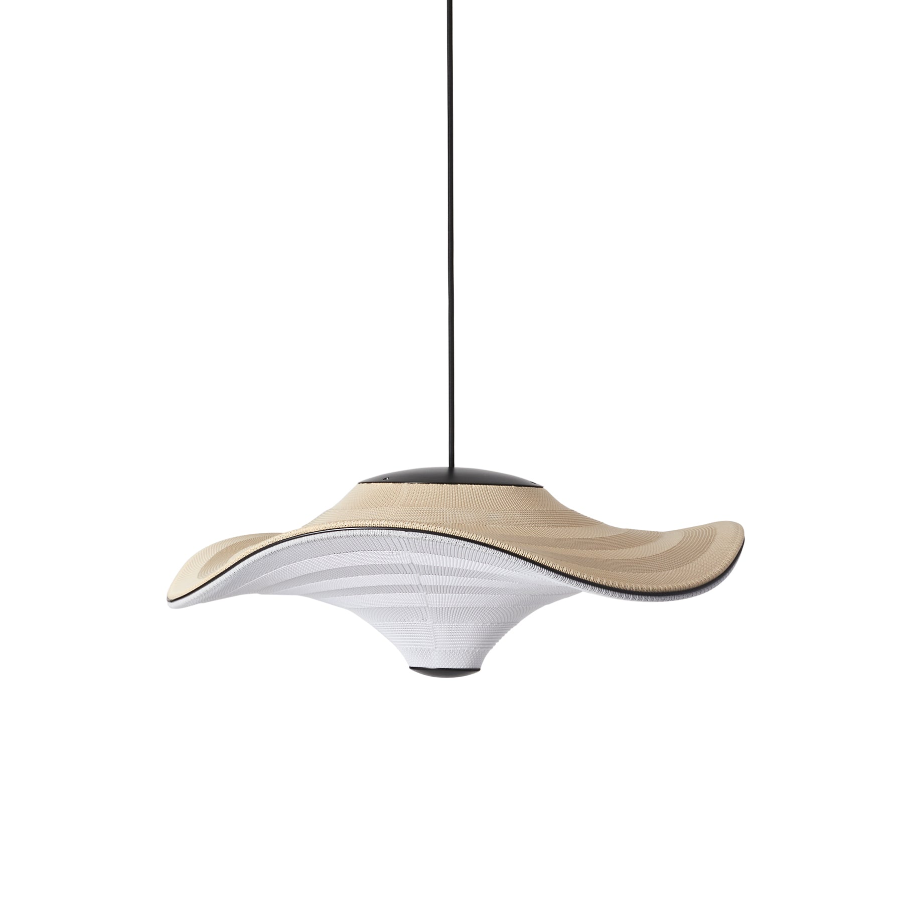 Flying is a family of sculptural pendant lamps with a soft organic shape. When suspended, they appear to float beautifully in the air. The distinctive shape of the Flying lamps is created by stretching the 3D knit material between the aluminium wavy frame and centerpiece that keeps the top and bottom apart. The LED light source is built into the top of the lamp so the light is softly diffused through the knitted bottom part of the lamp.